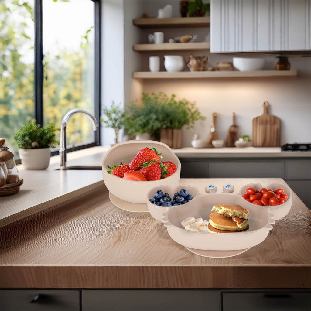 silikonowy talerzyk i miseczkę w miejscu.